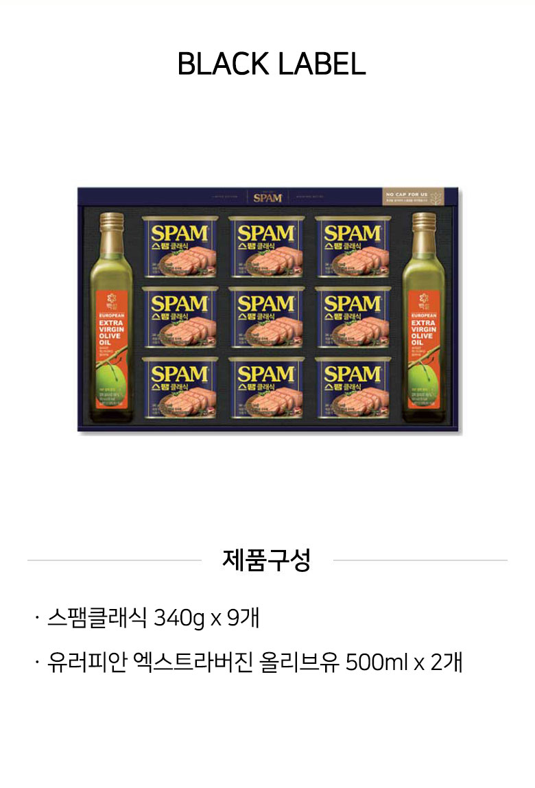 깊고 진한 풍미의 올리브유와 스팸이 어우러진 고품격 블랙라벨 세트입니다. VIP를 위한 예우를 담아 세련된 패키지로 가치를 높였습니다.