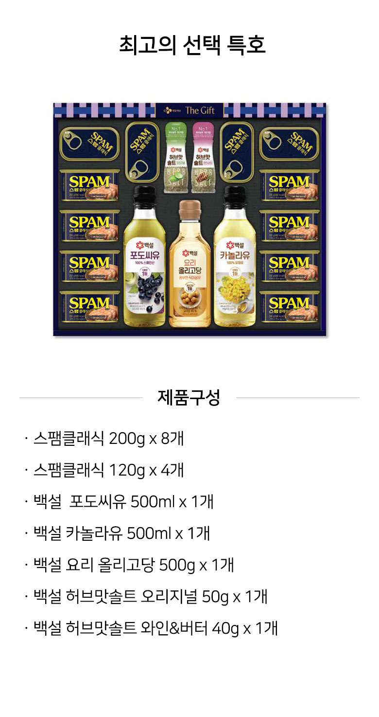 허브 향 솔솔 뿌린 스팸으로 캠핑장에서도 별미를 즐길 수 있는 구성입니다. 야외 활동이나 가정에서나 모두 환영받는 특별한 선택 특호 세트입니다.