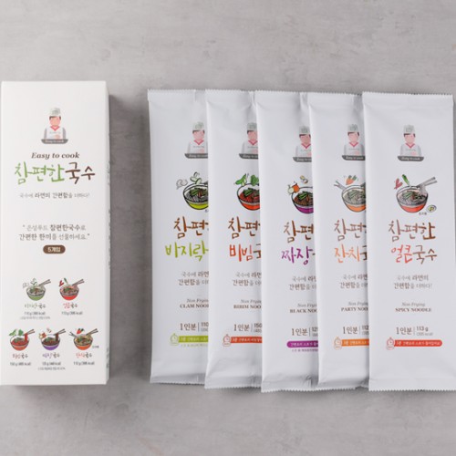 참편한 국수의 5가지 맛을 하나씩 경험해 볼 수 있는 맛보기 종합 구성입니다. 한 그릇의 정성을 3분이면 충분히 느낄 수 있어 개인 답례품이나 소규모 행사 기념품으로 매우 적합합니다.