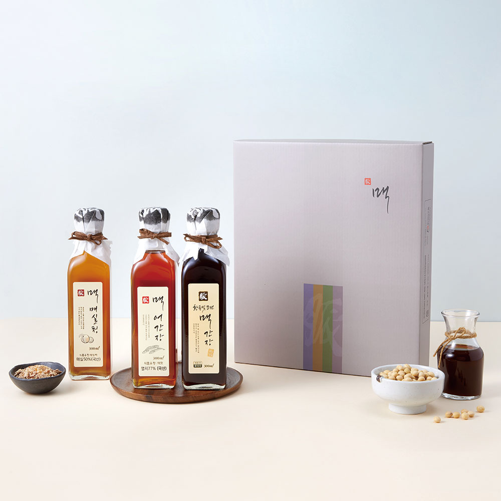 맥어간장, 황금빛맥간장, 맥매실청으로 구성된 기획 3종 세트입니다. 요리의 감칠맛을 살려주는 명인의 비법 장류와 청으로 구성되어, 요리의 품격을 높이고자 하는 분들께 최적의 선물이 됩니다.