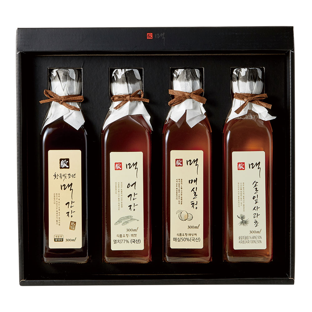 자연 발효의 깊은 풍미를 담은 어간장, 솔잎사과초, 맥간장, 매실청 4종 세트입니다. 건강한 발효 식초와 장류가 어우러져 품격 있는 주방을 완성하며, 건강을 생각하는 분들을 위한 정성 어린 기프트입니다.