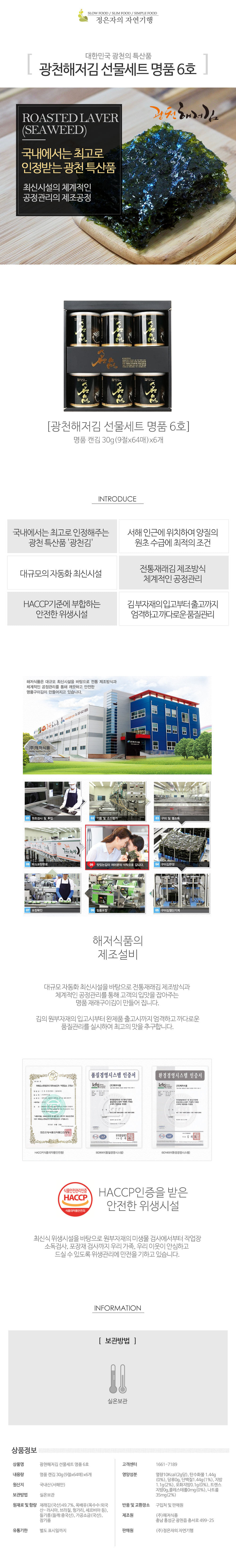 광천해저김 선물세트 명품 6호는 명품 캔김 6개로 구성된 실속형 캔김선물세트로, 부담 없는 예산으로 준비하는 명절선물·직원선물에 잘 맞습니다. 광천김·광천해저김·명품캔김·실속선물세트·서해안김·부담없는선물·소량선물·직원복지선물·답례품·명절선물세트 등의 검색 키워드를 고려한 구성입니다.