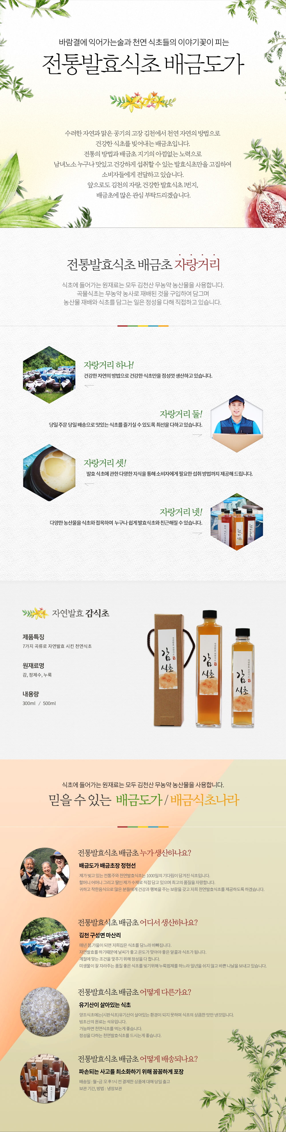 배금초 식초는 시간이 지날수록 발효가 깊어져 맛이 더욱 부드러워지며 직사광선을 피해 서늘한 곳에 보관하시면 오랫동안 본연의 맛을 유지합니다.