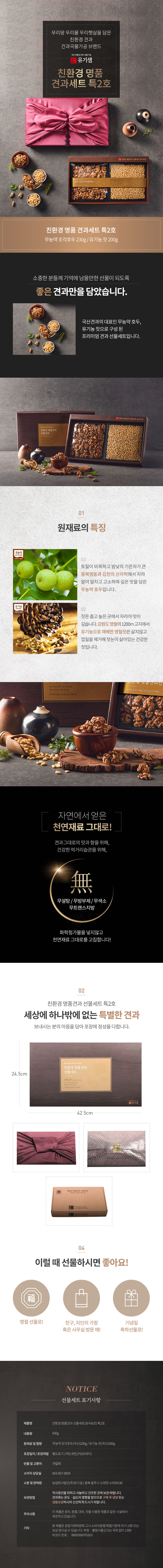 친환경 명품견과 특2호는 넉넉한 용량의 무농약 조각호두와 유기농 잣을 담아 풍성함을 더했습니다. 명절 고객감사 선물이나 우수직원 시상품으로 자주 활용되며, 믿을 수 있는 국산 친환경 원료로 정직하게 만든 유기샘의 대표 세트입니다.