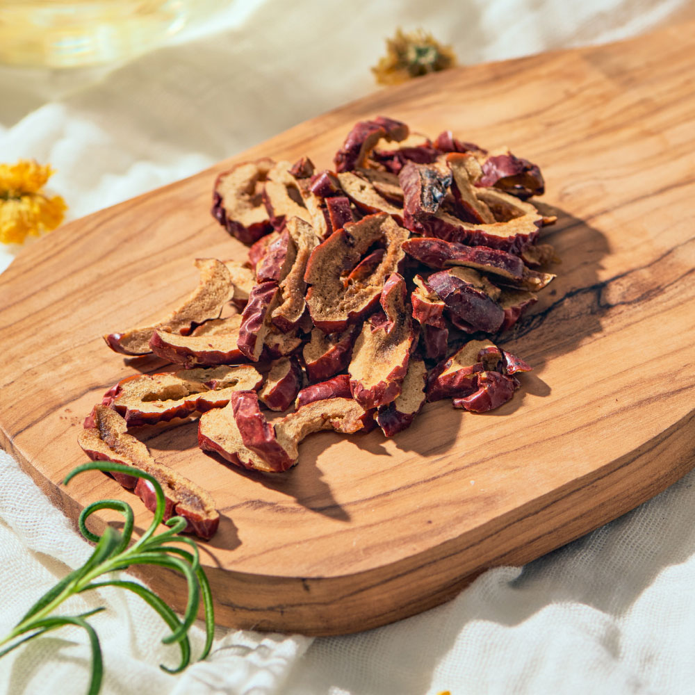 바삭한 대추칩은 남녀노소 선호하는 맛으로, 사내 탕비실 만족도 조사에서 상위권을 차지하는 유기샘의 대표 친환경 스낵입니다.