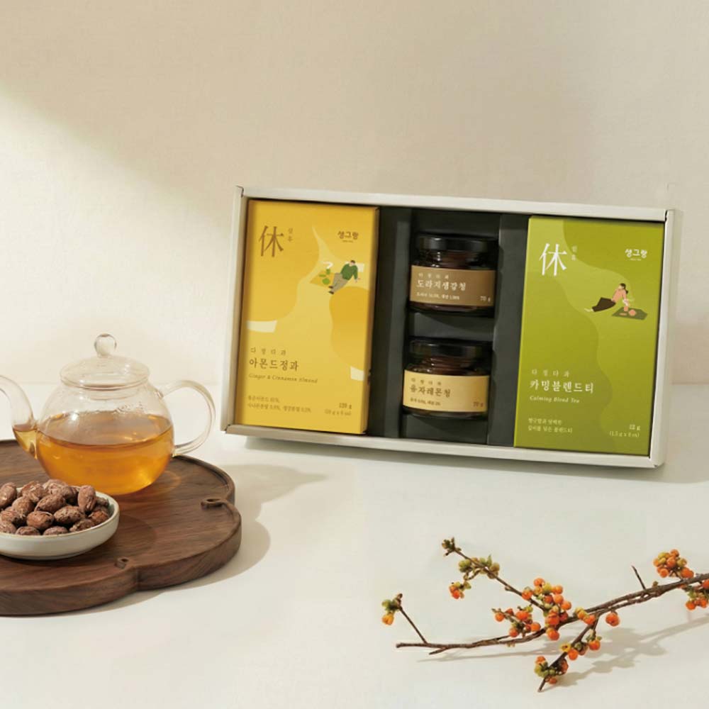 카밍 블렌드 티와 아몬드정과, 도라지생강청, 유자레몬청으로 구성된 휴식형 다과 세트입니다. 차 한 잔의 여유를 선물할 수 있는 구성으로, 소중한 분들의 평안한 일상을 기원하는 마음을 담기에 최적화된 기프트입니다.