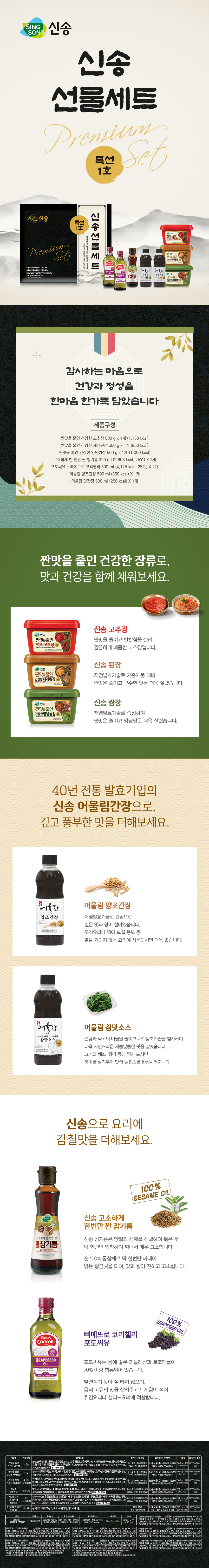 신송만의 기술력으로 짠맛은 줄이고 맛의 깊이는 살린 건강한 장류 3종에 이탈리아산 포도씨유와 양조간장을 더했습니다. 온 가족의 건강한 식단을 생각하는 분들을 위해 영양 밸런스를 맞춘 알찬 구성으로, 명절 인사용 실속 기프트로 추천합니다.